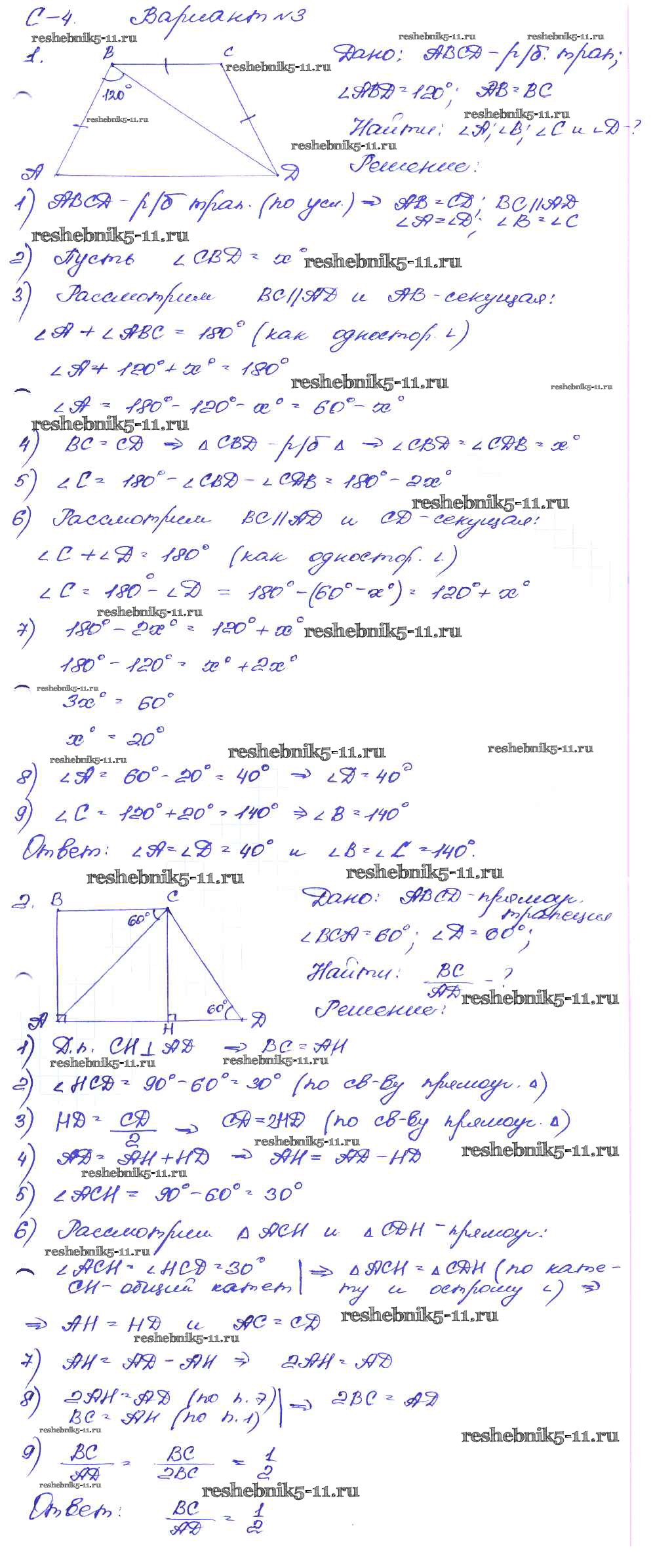Готовая домашняя работа с ответами по Геометрии за 8 класс Зив, Мейлер Дидактические материалы Просвещение 2016 ФГОС - СР №4. Трапеция вариант-3