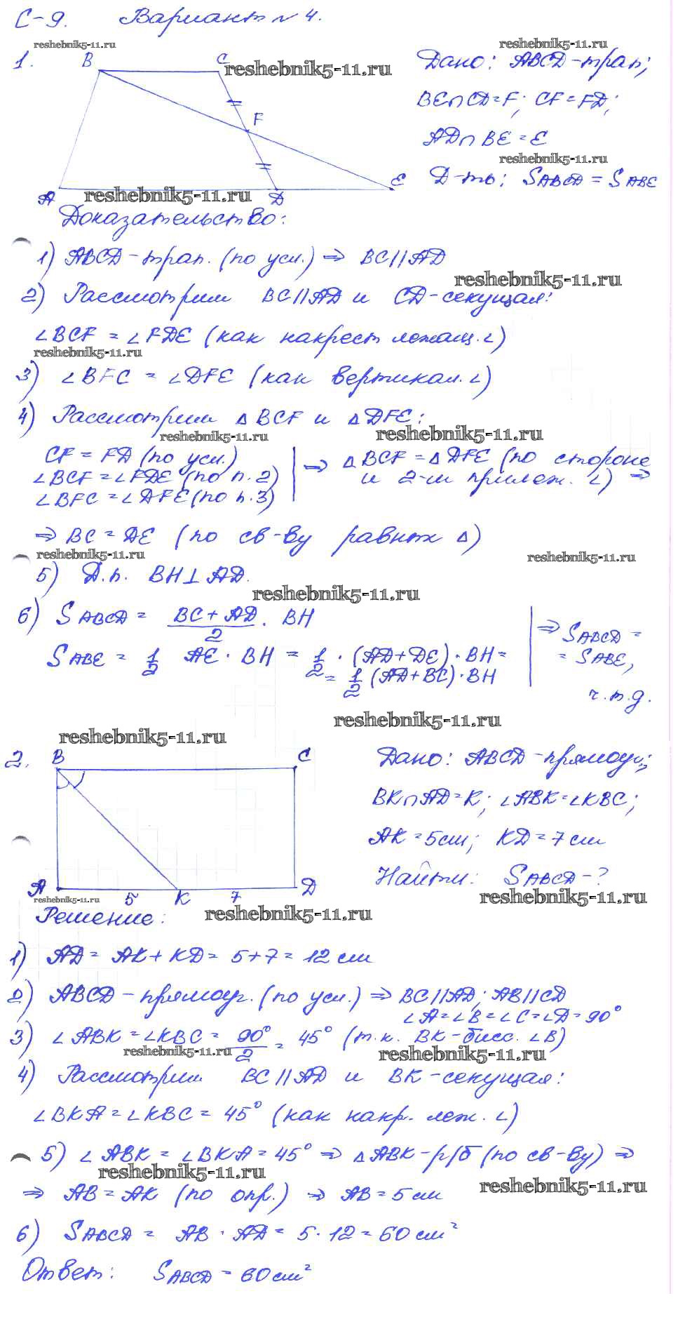 Готовая домашняя работа с ответами по Геометрии за 8 класс Зив, Мейлер Дидактические материалы Просвещение 2016 ФГОС - СР №9. Свойства площадей многоугольников, квадрата и прямоугольника вариант-4