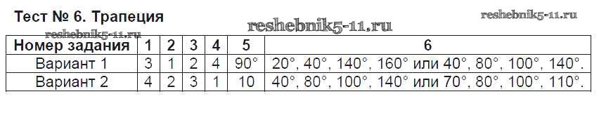 Готовая домашняя работа с ответами по Геометрии за 8 класс Рязановский, Мухин Контрольно-измерительные материалы (КИМ) Экзамен 2014 ФГОС - Тесты Тест №6. Трапеция