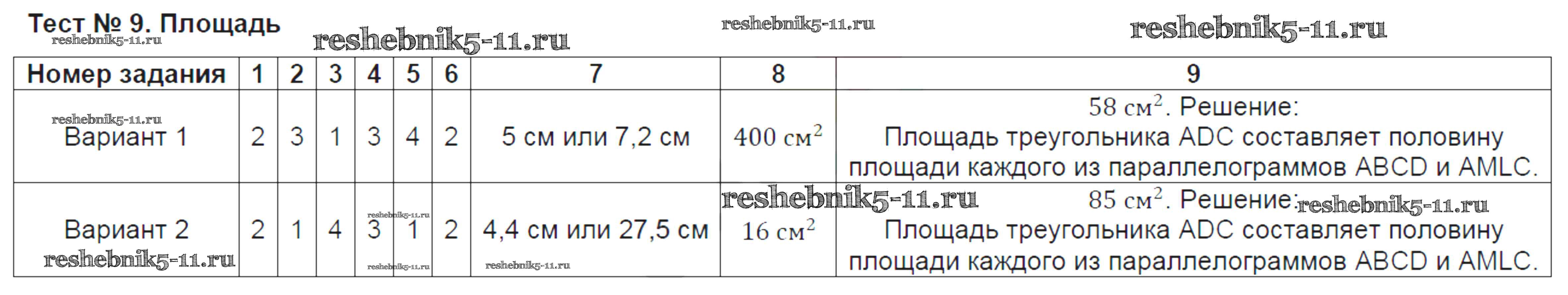 Готовая домашняя работа с ответами по Геометрии за 8 класс Рязановский, Мухин Контрольно-измерительные материалы (КИМ) Экзамен 2014 ФГОС - Тесты Тест №9. Площадь