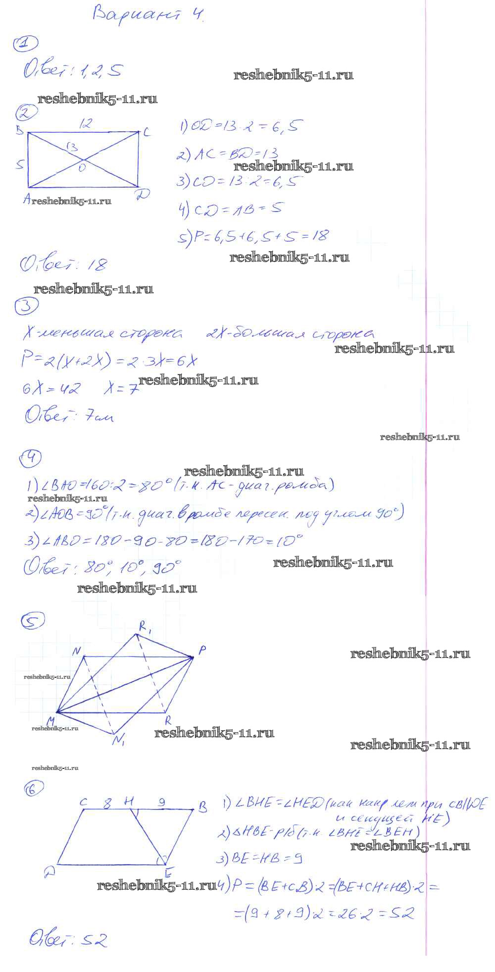 Готовая домашняя работа с ответами по Геометрии за 8 класс Мельникова Контрольные работы УМК Экзамен 2013 ФГОС - КР-1. Четырехугольники Вариант №4