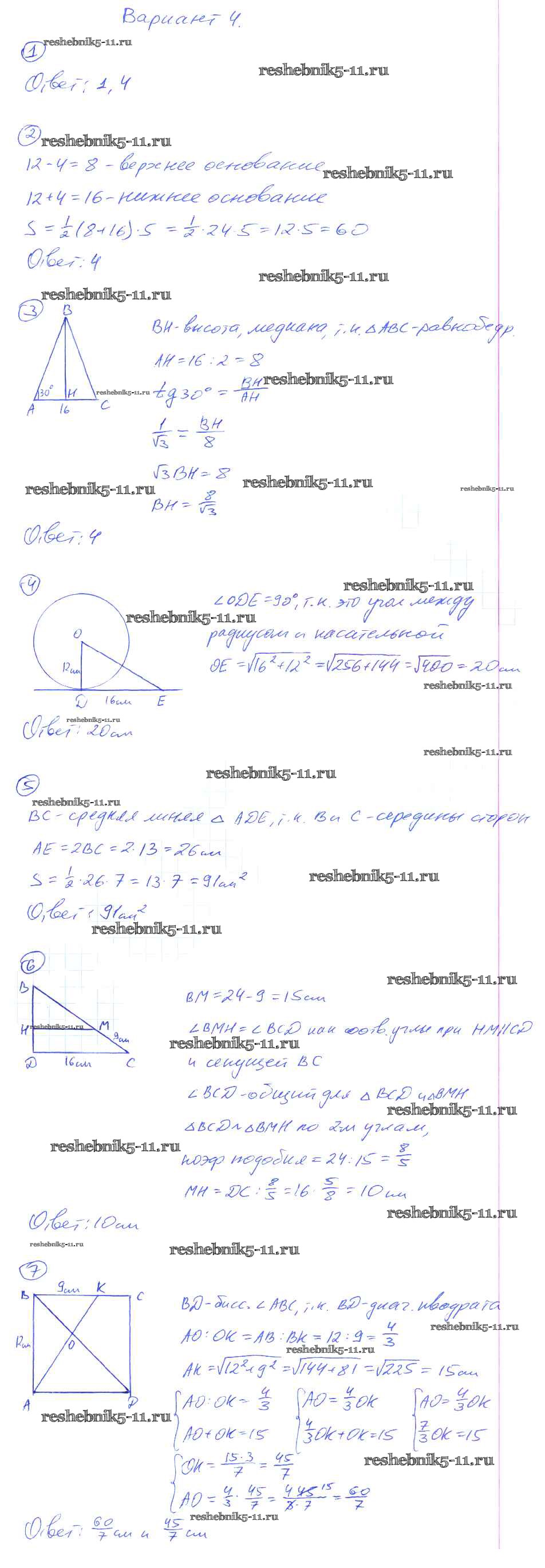 Готовая домашняя работа с ответами по Геометрии за 8 класс Мельникова Контрольные работы УМК Экзамен 2013 ФГОС - КР-5. Итоговая Вариант №4