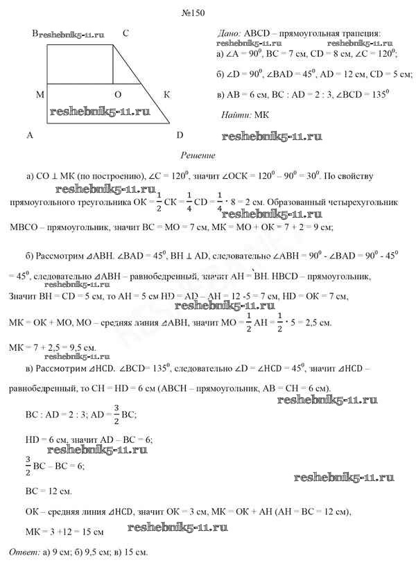 Готовая домашняя работа с ответами по Геометрии за 8 класс Казаков Учебник Народная асвета 2018 - Задачи 150