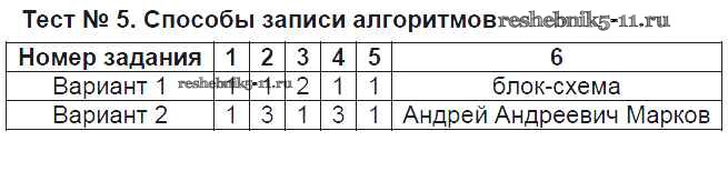 Готовая домашняя работа с ответами по Информатике за 8 класс Масленикова Контрольно-измерительные материалы (КИМ) ВАКО 2017 ФГОС - Тесты Тест №5. Способы записи алгоритмов