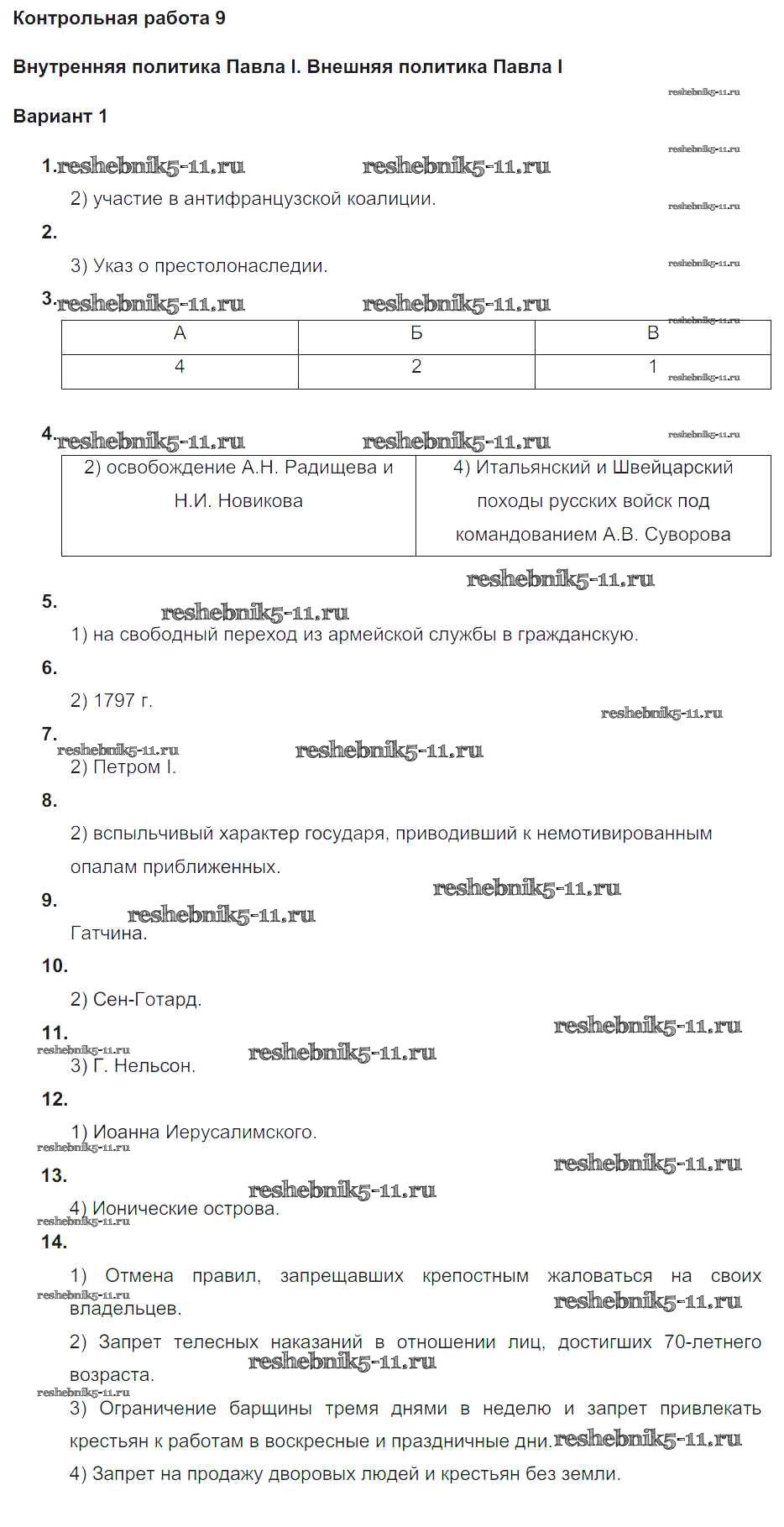 Готовая домашняя работа с ответами по Истории за 8 класс Соловьев Контрольные работы УМК Экзамен 2019 ФГОС - КР-9. Варианты 1