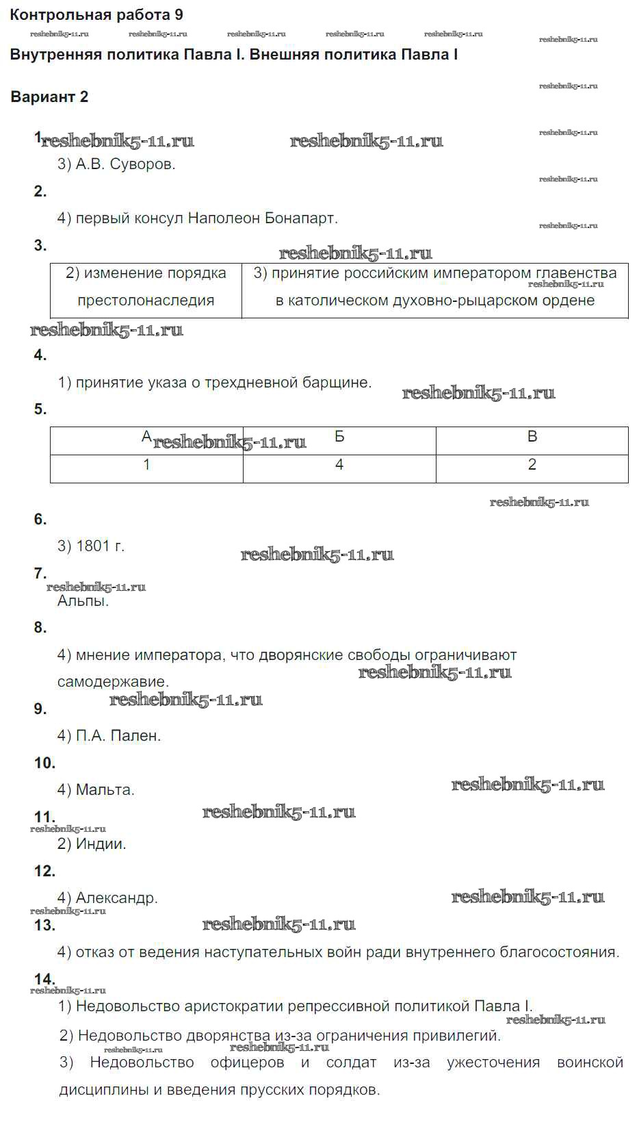 Готовая домашняя работа с ответами по Истории за 8 класс Соловьев Контрольные работы УМК Экзамен 2019 ФГОС - КР-9. Варианты 2