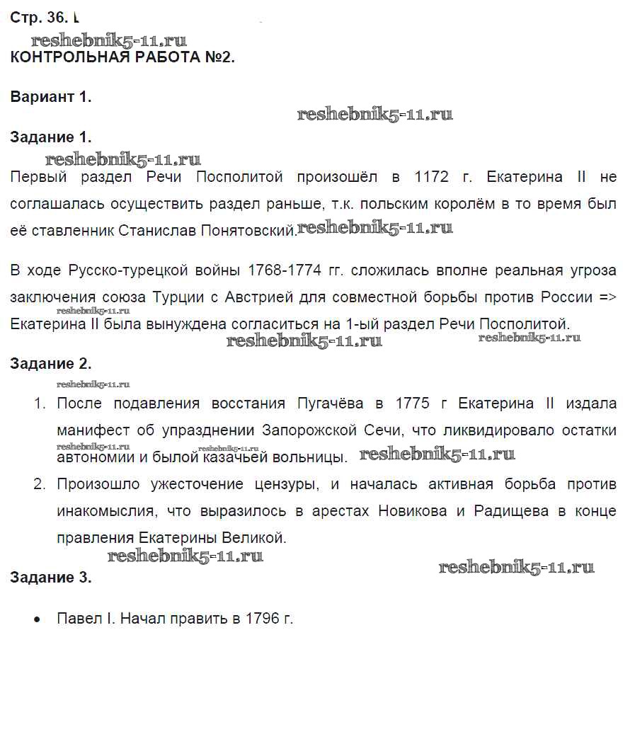 Готовая домашняя работа с ответами по Истории за 8 класс Артасов Контрольные работы УМК Просвещение 2016 ФГОС - Страницы 36