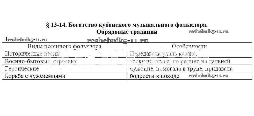 Готовая домашняя работа с ответами по Кубановедению за 8 класс Гриценко Рабочая тетрадь Перспективы образования 2018 - § 13-14. Богатство кубанского музыкального фольклора. Обрядовые традиции 1
