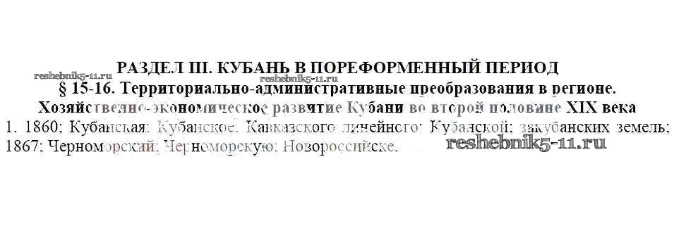 Готовая домашняя работа с ответами по Кубановедению за 8 класс Гриценко Рабочая тетрадь Перспективы образования 2018 - § 15-16. Территориально-административные преобразования в регионе Хозяйственно-экономическое развитие Кубани во второй половине XIX века 1