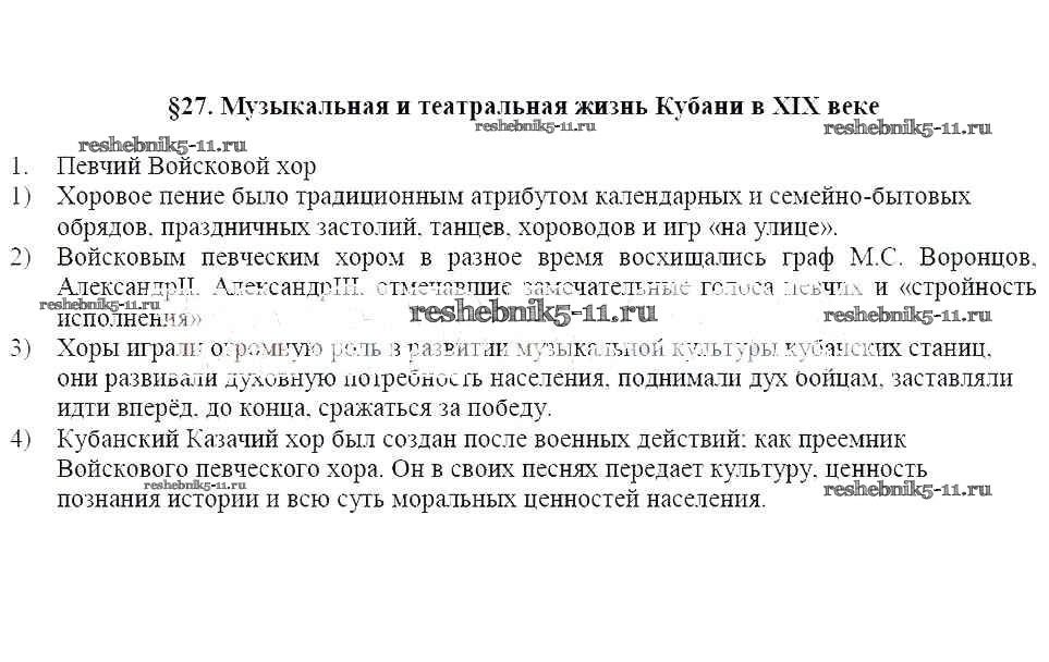 Готовая домашняя работа с ответами по Кубановедению за 8 класс Гриценко Рабочая тетрадь Перспективы образования 2018 - § 27. Музыкальная и театральная жизнь Кубани в XIX веке 1