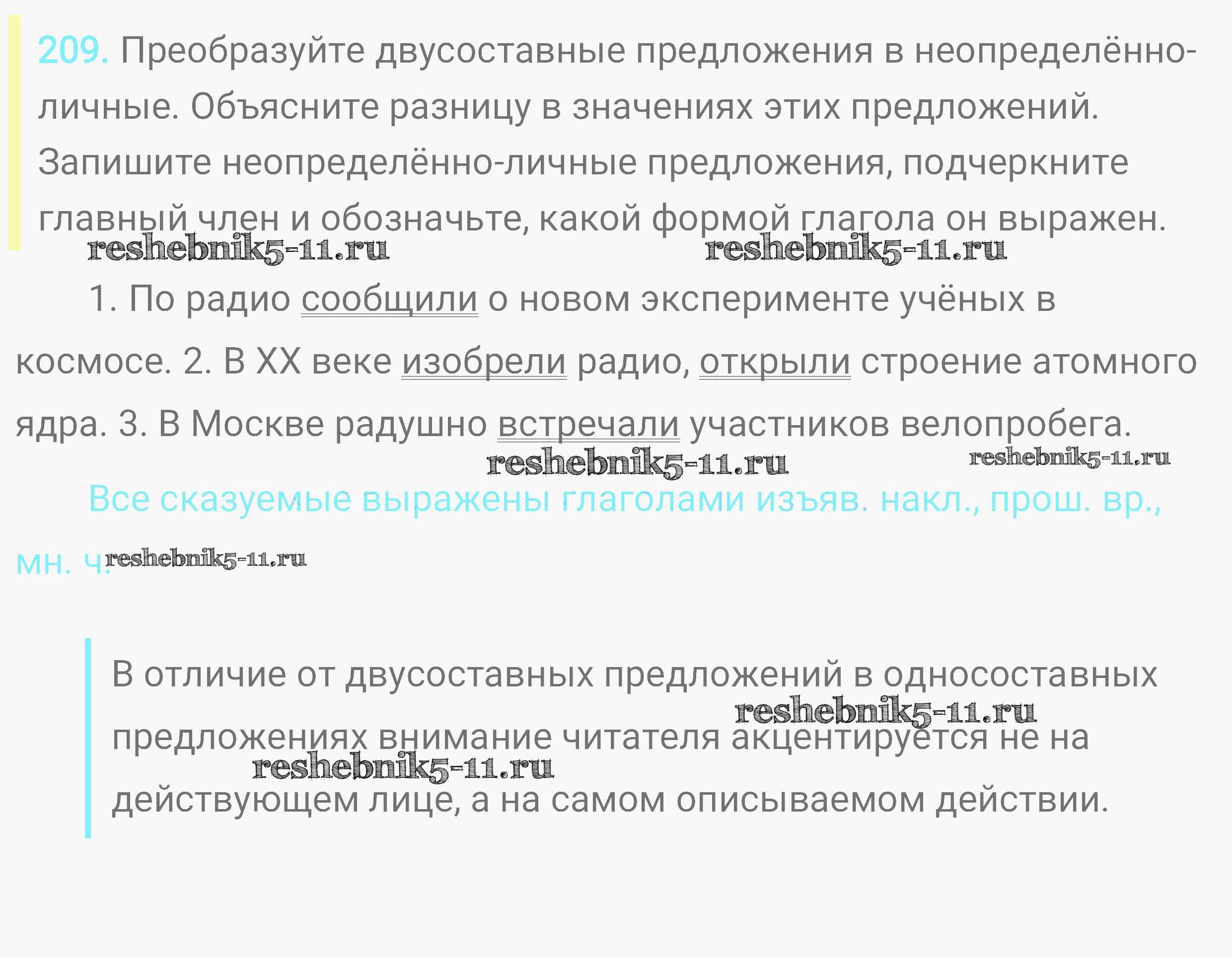 Готовая домашняя работа с ответами по Русскому языку за 8 класс Пичугов, Еремеева, Купалова, Леденева Практика Вертикаль Дрофа 2016 ФГОС - Упражнения 209
