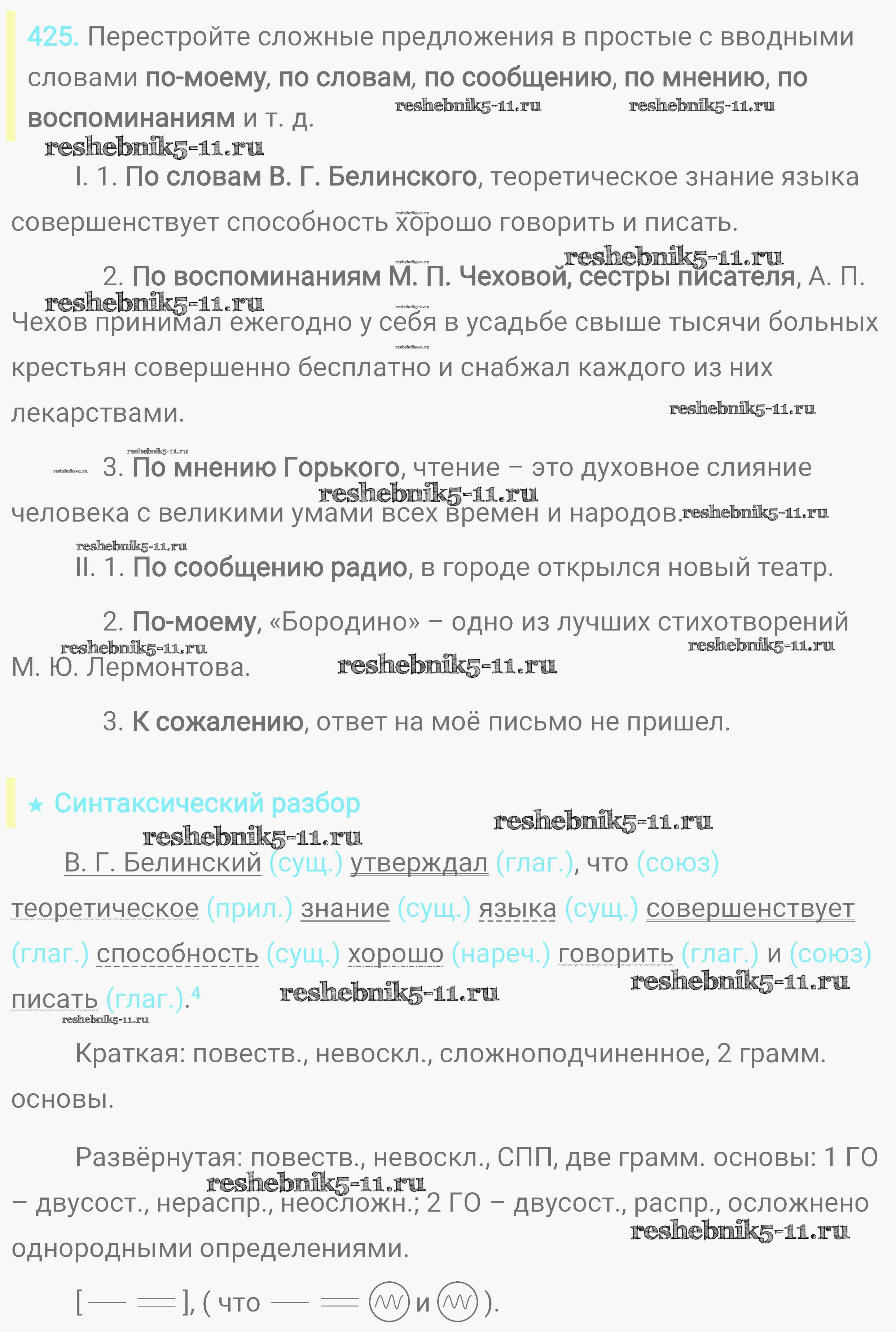 Готовая домашняя работа с ответами по Русскому языку за 8 класс Пичугов, Еремеева, Купалова, Леденева Практика Вертикаль Дрофа 2016 ФГОС - Упражнения 425