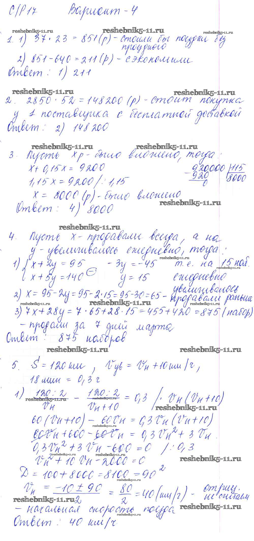 Готовая домашняя работа с ответами по Алгебре за 9 класс Глазков, Варшавский, Гаиашвили Самостоятельные и контрольные работы УМК Экзамен 2013 ФГОС - СР-17. Итоговое повторение. Решение текстовых задач вариант 4