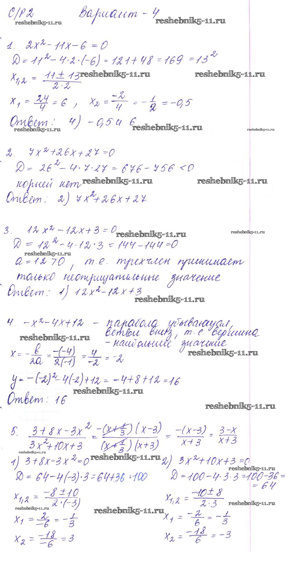 Готовая домашняя работа с ответами по Алгебре за 9 класс Глазков, Варшавский, Гаиашвили Самостоятельные и контрольные работы УМК Экзамен 2013 ФГОС - СР-2. Квадратный трехчлен вариант 4