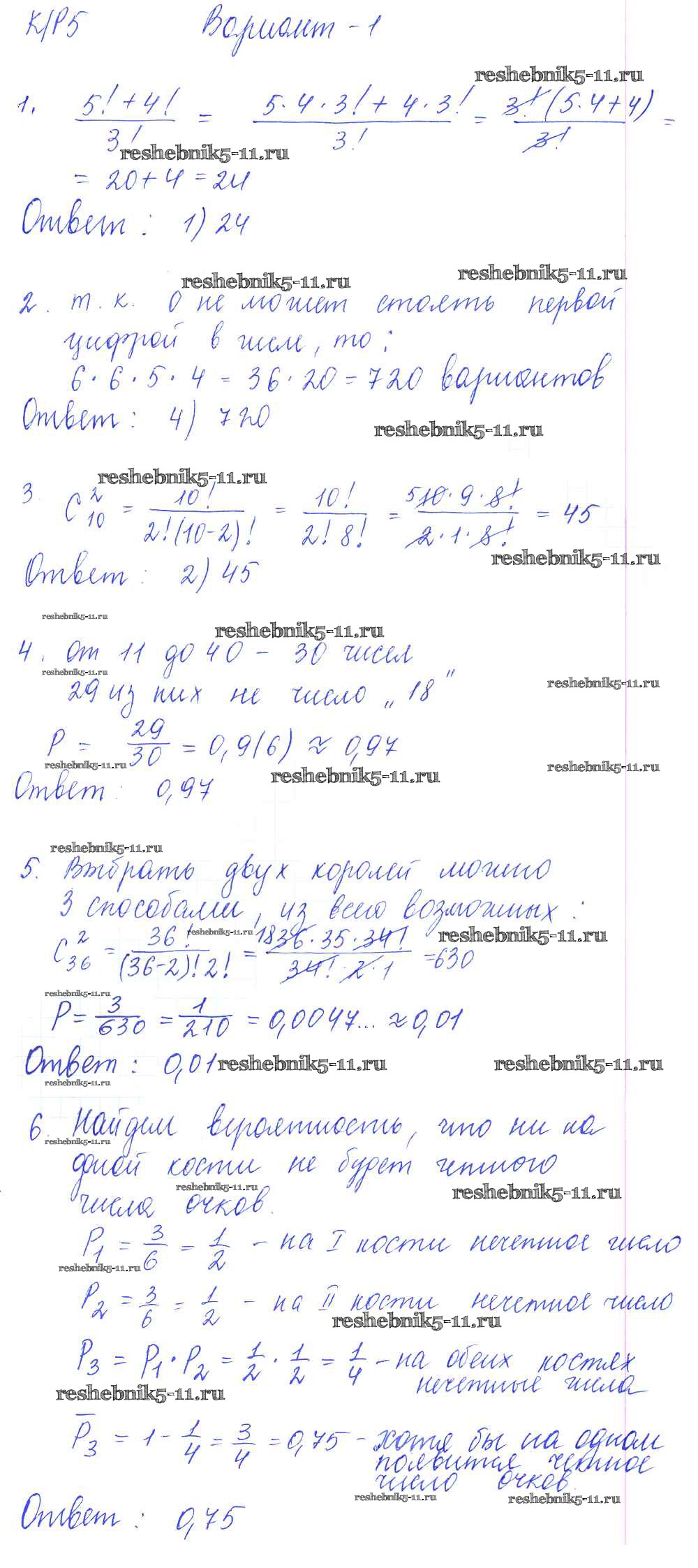 Готовая домашняя работа с ответами по Алгебре за 9 класс Глазков, Варшавский, Гаиашвили Самостоятельные и контрольные работы УМК Экзамен 2013 ФГОС - КР-5. Элементы комбинаторики и теории вероятностей вариант 1