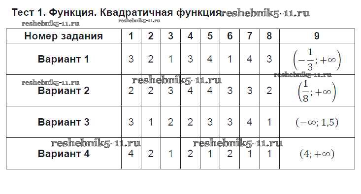 Готовая домашняя работа с ответами по Алгебре за 9 класс Дудницын, Кронгауз Тематические тесты Просвещение 2017 ФГОС - Тесты Тест 1. Функция. Квадратичная функция
