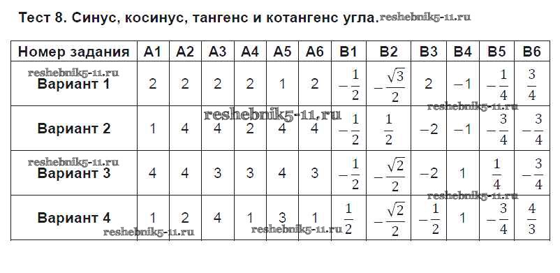 Тест №8. Синус, косинус, тангенс и котангенс угла