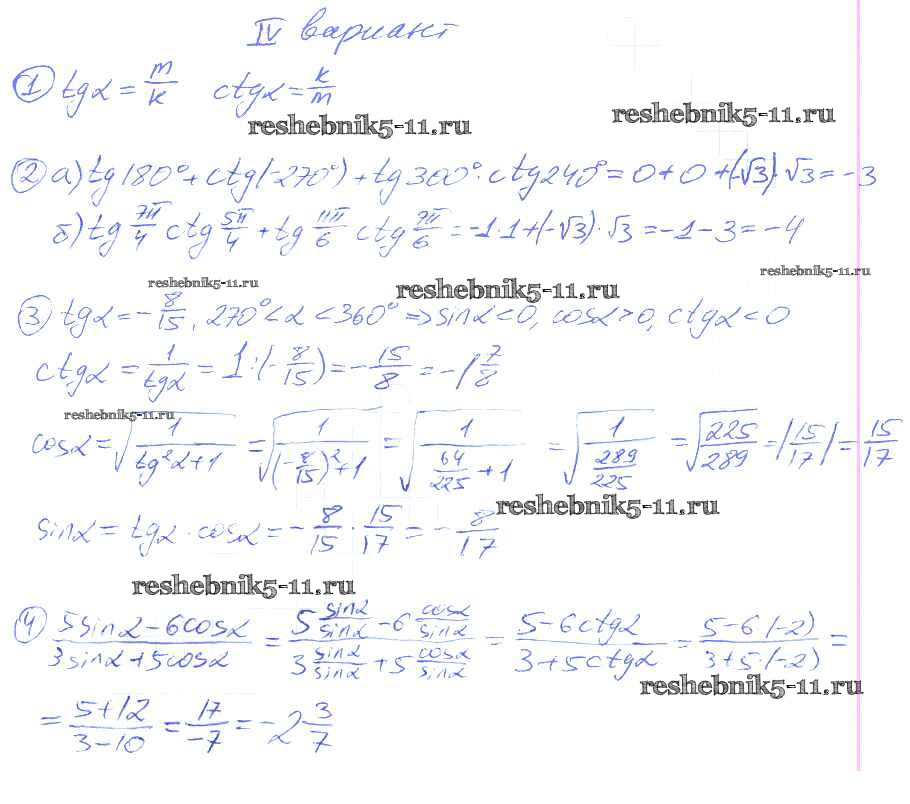 Готовая домашняя работа с ответами по Алгебре за 9 класс Потапов, Шевкин Дидактические материалы МГУ - школе Просвещение 2010 ФГОС - СР №25. Тангенс и котангенс угла вариант 4