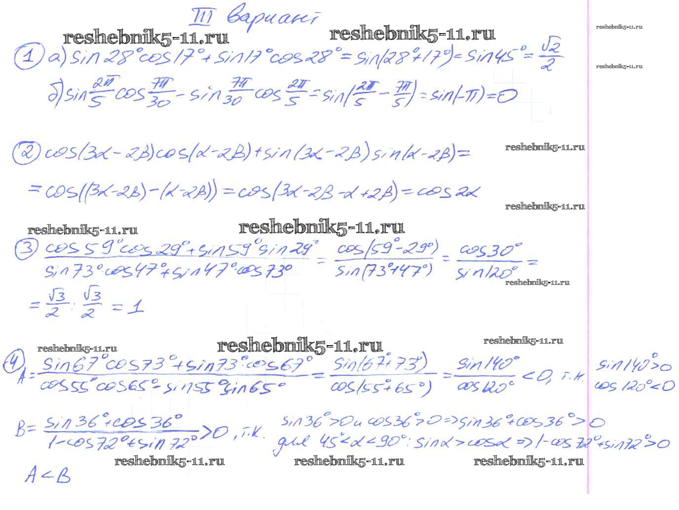 Готовая домашняя работа с ответами по Алгебре за 9 класс Потапов, Шевкин Дидактические материалы МГУ - школе Просвещение 2010 ФГОС - СР №26. Косинус суммы и косинус разности двух углов. Синус суммы и синус разности двух углов вариант 3