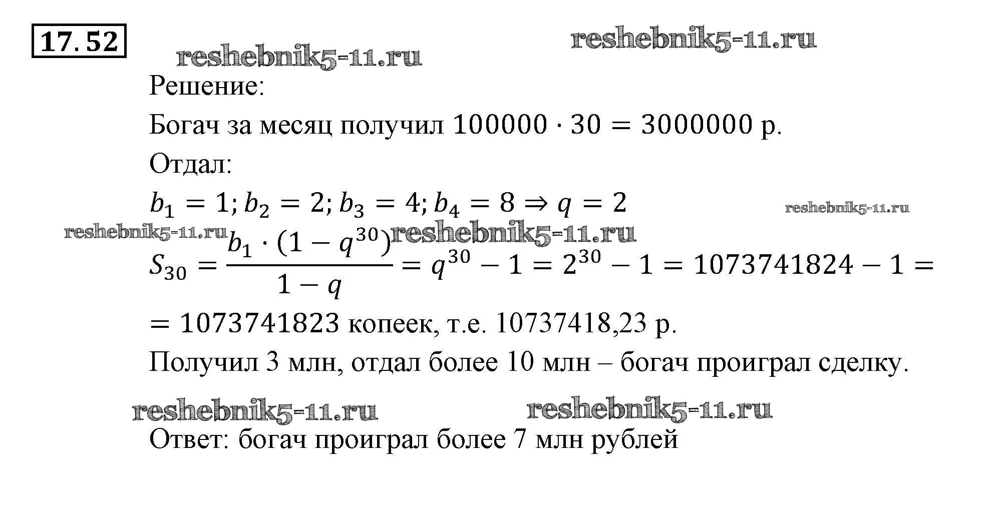 Готовая домашняя работа с ответами по Алгебре за 9 класс Мордкович, Александрова, Мишустина, Тульчинская, Семёнов Задачник Часть 2 Мнемозина 2010 ФГОС - § 17. Геометрическая прогрессия 52