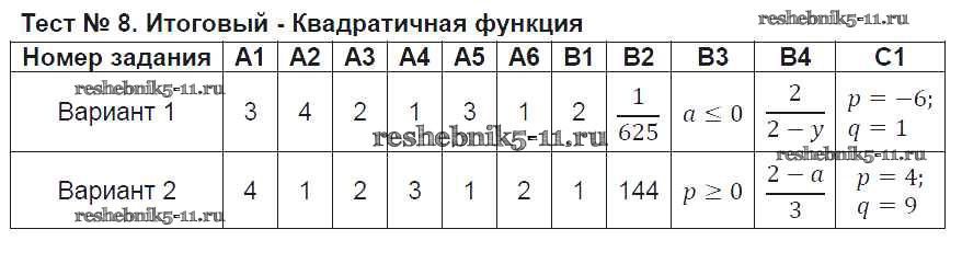 Готовая домашняя работа с ответами по Алгебре за 9 класс Мартышова Контрольно-измерительные материалы (КИМ) ВАКО 2015 ФГОС - Тесты Тест №8. Итоговый - Квадратичная функция