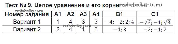 Готовая домашняя работа с ответами по Алгебре за 9 класс Мартышова Контрольно-измерительные материалы (КИМ) ВАКО 2015 ФГОС - Тесты Тест №9. Целое уравнение и его корни