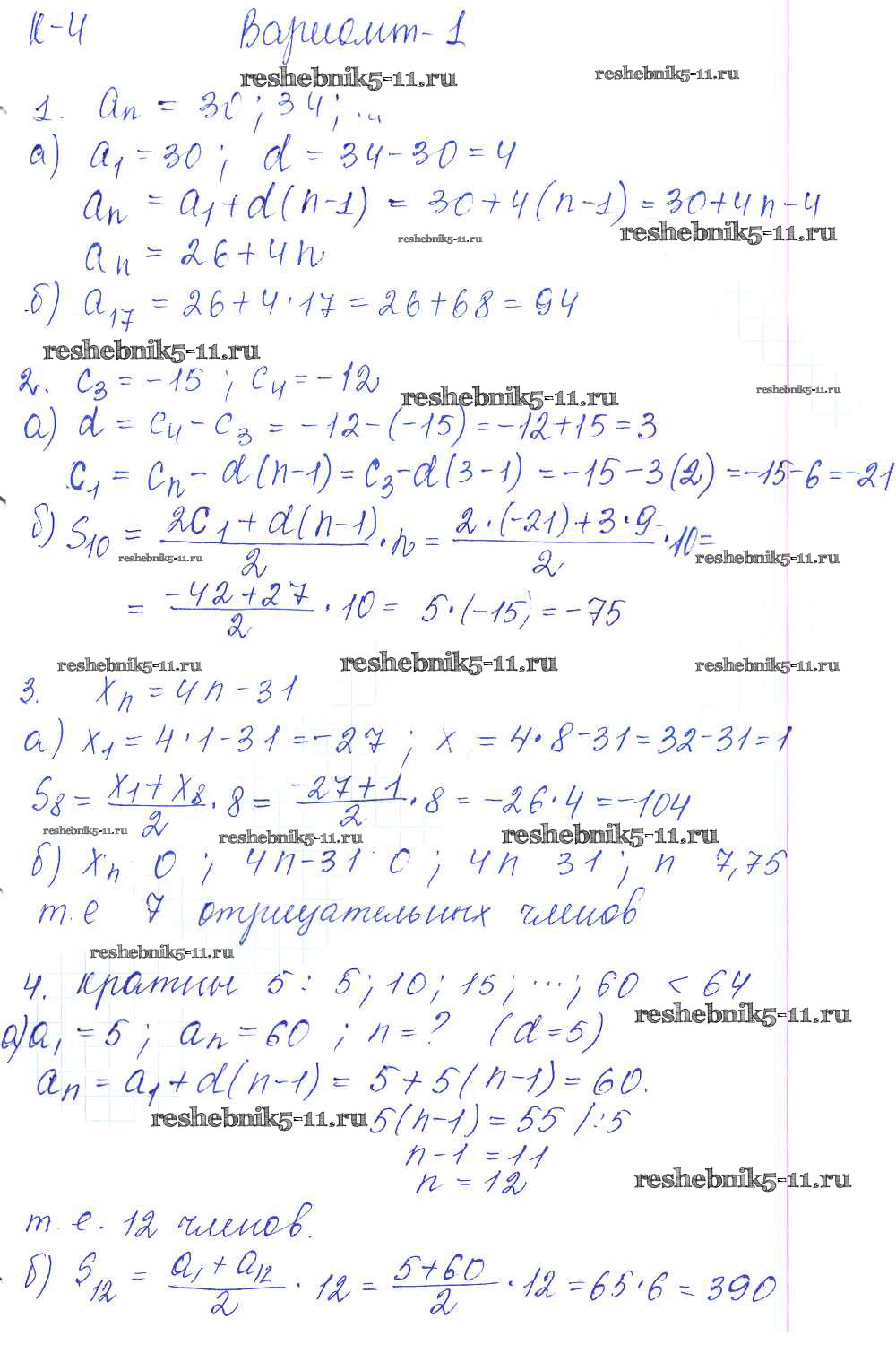 Готовая домашняя работа с ответами по Алгебре за 9 класс Журавлев, Малышева, Свентковский Контрольные и самостоятельные работы УМК Экзамен 2016 ФГОС - К-4. Арифметическая прогрессия Вариант №1