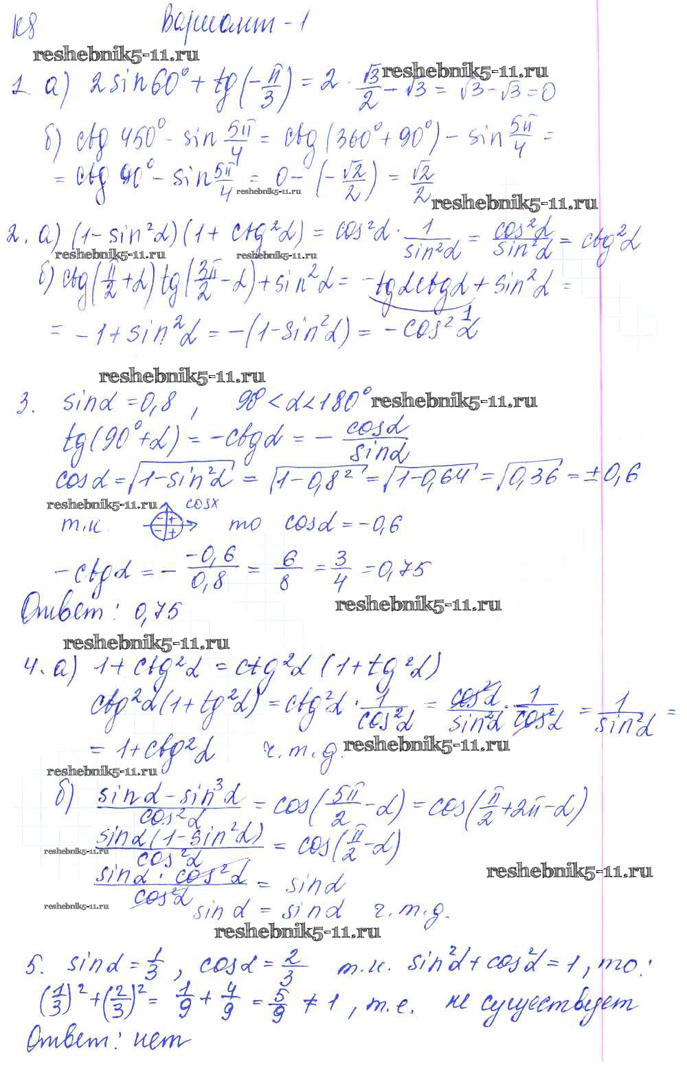 Готовая домашняя работа с ответами по Алгебре за 9 класс Журавлев, Малышева, Свентковский Контрольные и самостоятельные работы УМК Экзамен 2016 ФГОС - К-8. Свойства тригонометрических функций. Тригонометрические тождества. Формулы приведения Вариант №1