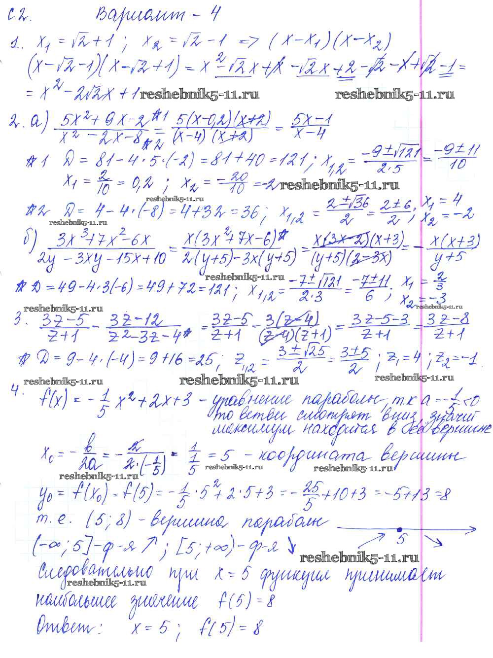 Готовая домашняя работа с ответами по Алгебре за 9 класс Журавлев, Малышева, Свентковский Контрольные и самостоятельные работы УМК Экзамен 2016 ФГОС - С-2. Квадратный трехчлен Вариант №4