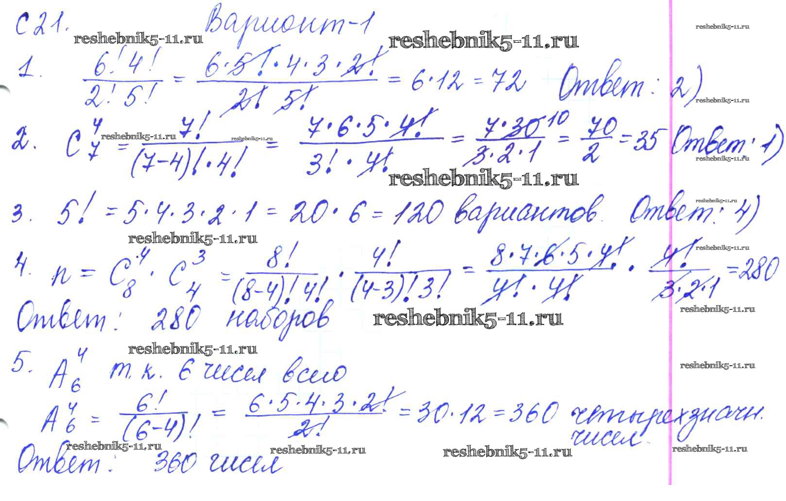 Готовая домашняя работа с ответами по Алгебре за 9 класс Журавлев, Малышева, Свентковский Контрольные и самостоятельные работы УМК Экзамен 2016 ФГОС - С-21. Элементы комбинаторики Вариант №1