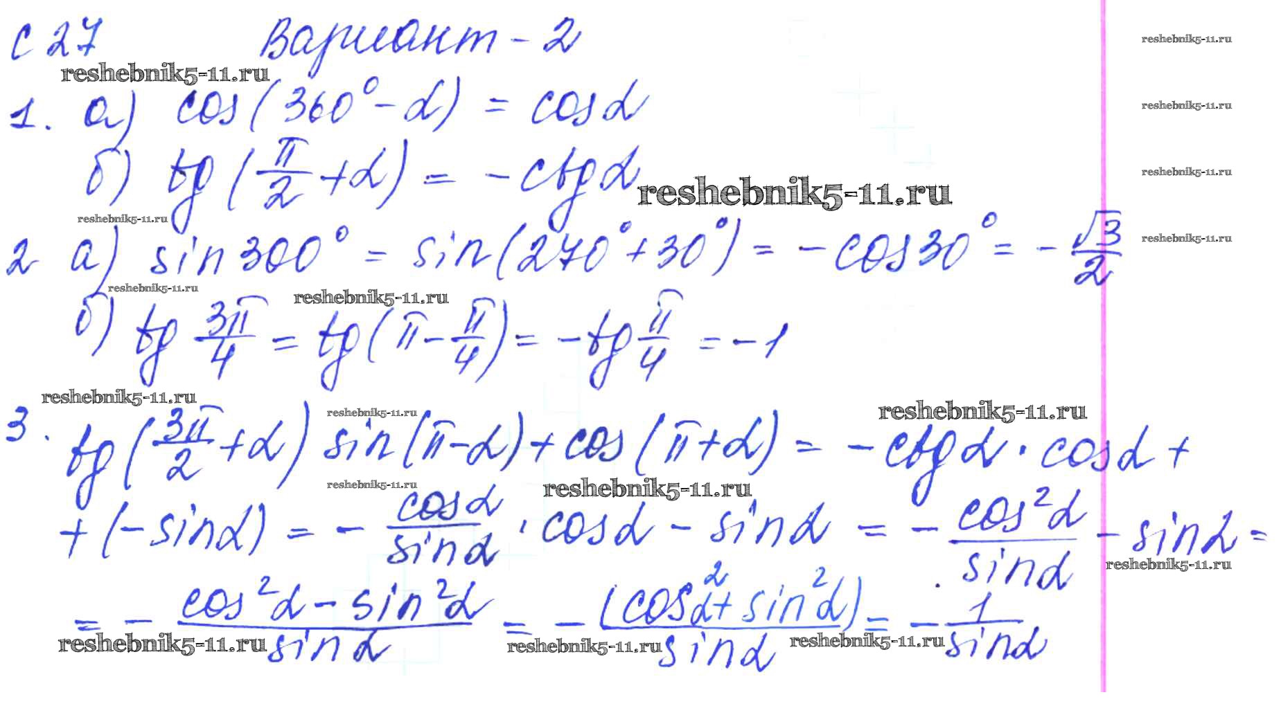 Готовая домашняя работа с ответами по Алгебре за 9 класс Журавлев, Малышева, Свентковский Контрольные и самостоятельные работы УМК Экзамен 2016 ФГОС - С-27. Формулы приведения Вариант №2