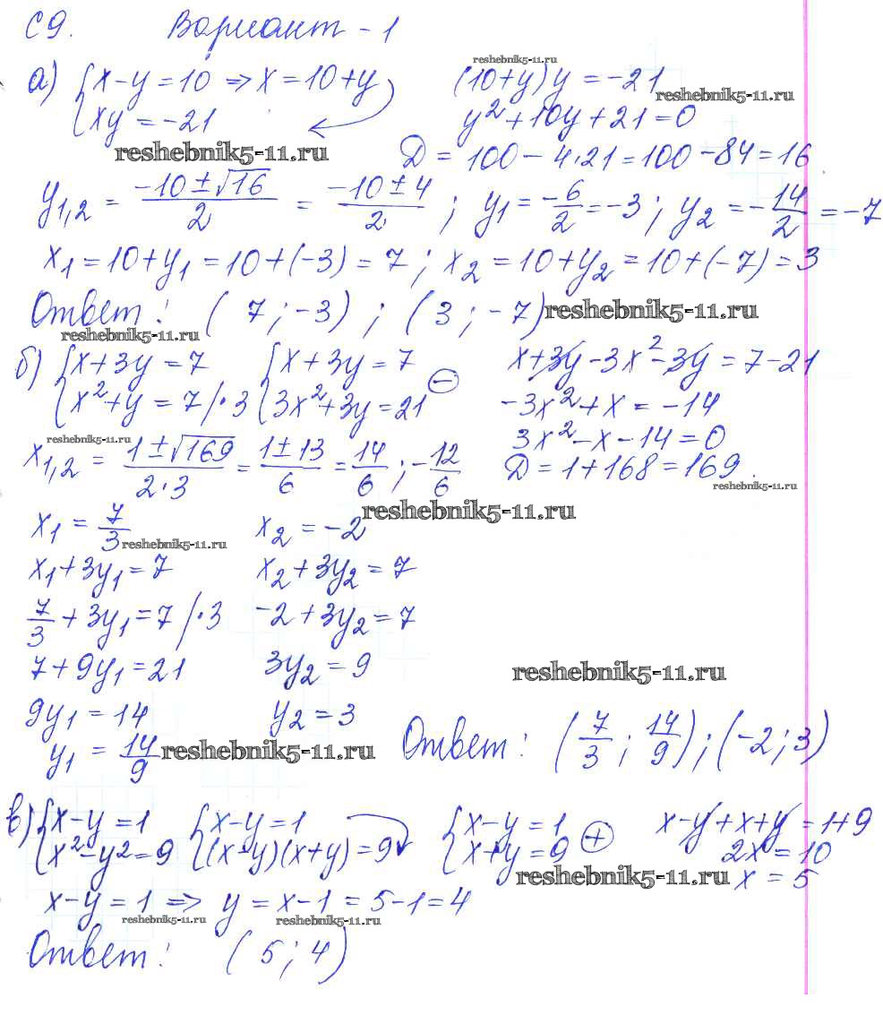 Готовая домашняя работа с ответами по Алгебре за 9 класс Журавлев, Малышева, Свентковский Контрольные и самостоятельные работы УМК Экзамен 2016 ФГОС - С-9. Решение систем уравнений второй степени Вариант №1