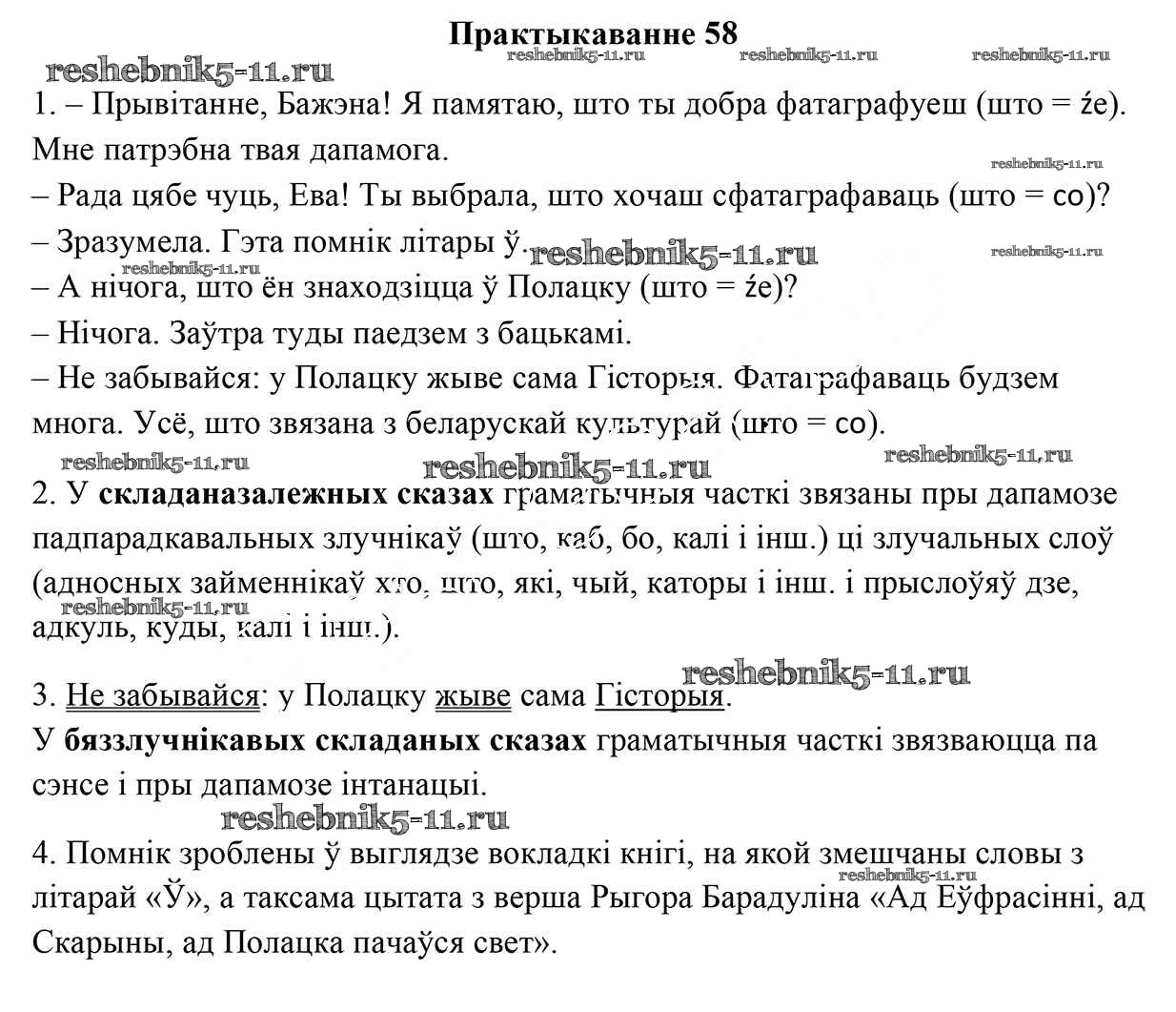 Готовая домашняя работа с ответами по Белорусскому языку за 9 класс Валочка, Васюковіч, Зелянко, Якуба, Байкова Учебник Национальный институт образования 2019 ФГОС - Практыкаванні 58