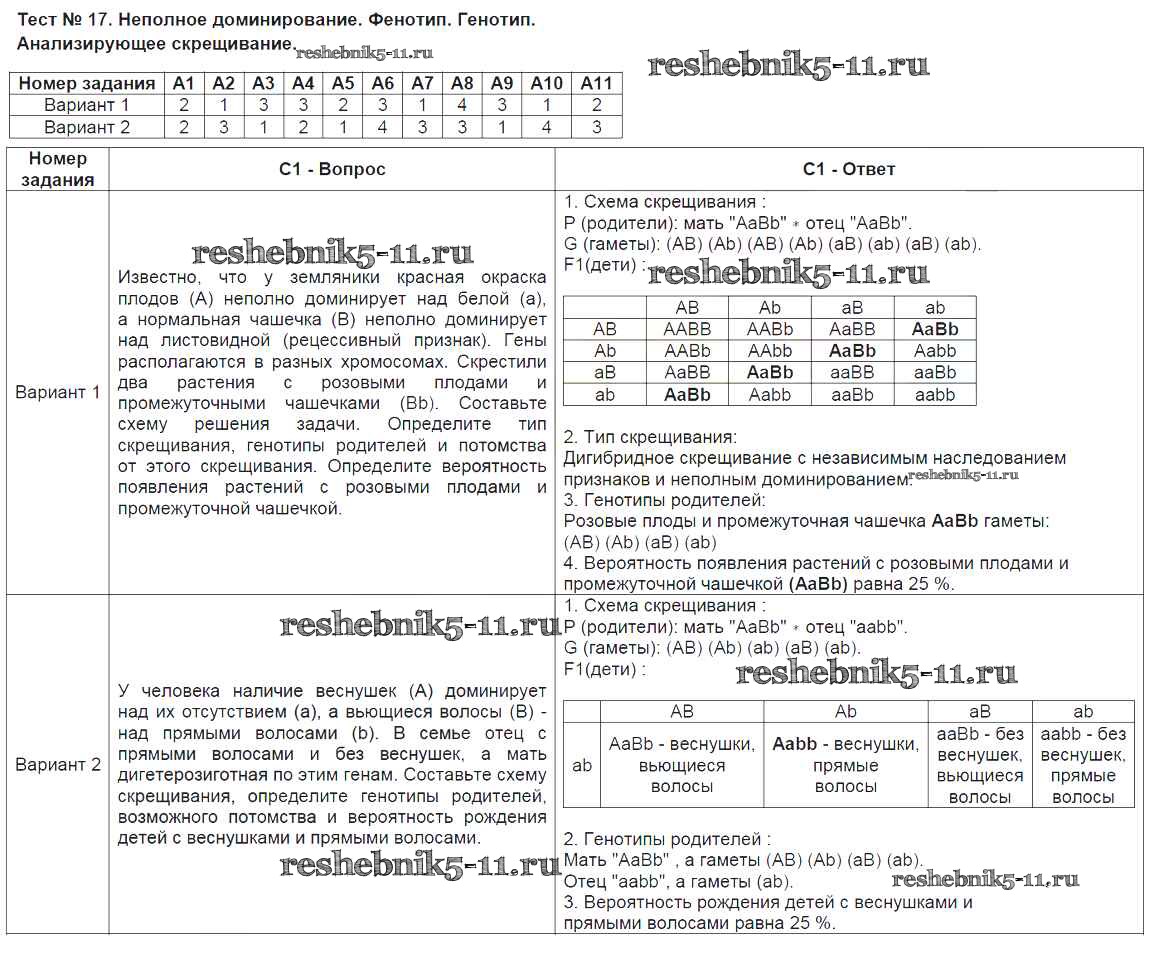 Готовая домашняя работа с ответами по Биологии за 9 класс Богданов Контрольно-измерительные материалы (КИМ) ВАКО 2017 ФГОС - Тесты Тест №17. Неполное доминирование. Фенотип. Генотип. Анализирующее скрещивание