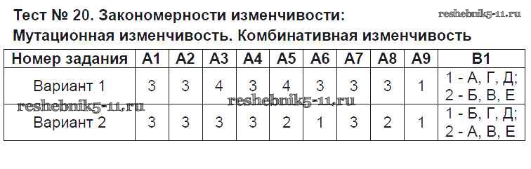 Готовая домашняя работа с ответами по Биологии за 9 класс Богданов Контрольно-измерительные материалы (КИМ) ВАКО 2017 ФГОС - Тесты Тест №20. Закономерности изменчивости - Мутационная изменчивость. Комбинативная изменчивость