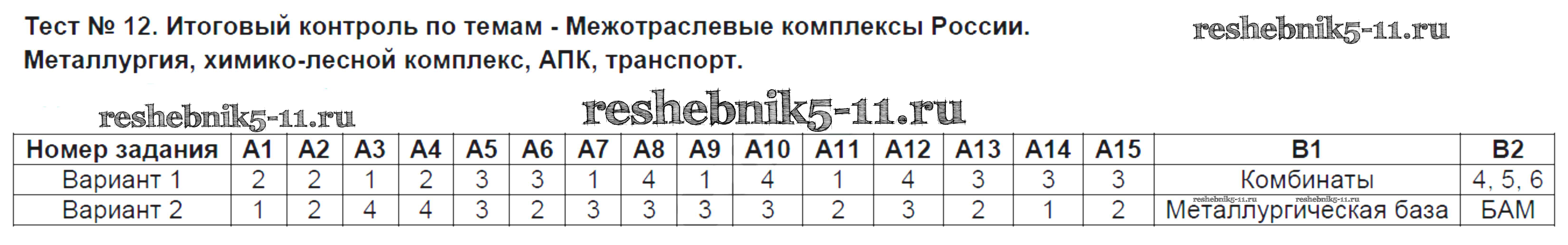Готовая домашняя работа с ответами по Географии за 9 класс Жижина Контрольно-измерительные материалы (КИМ) ВАКО 2017 ФГОС - Тесты Тест №12. Итоговый контроль по темам - Межотраслевые комплексы России