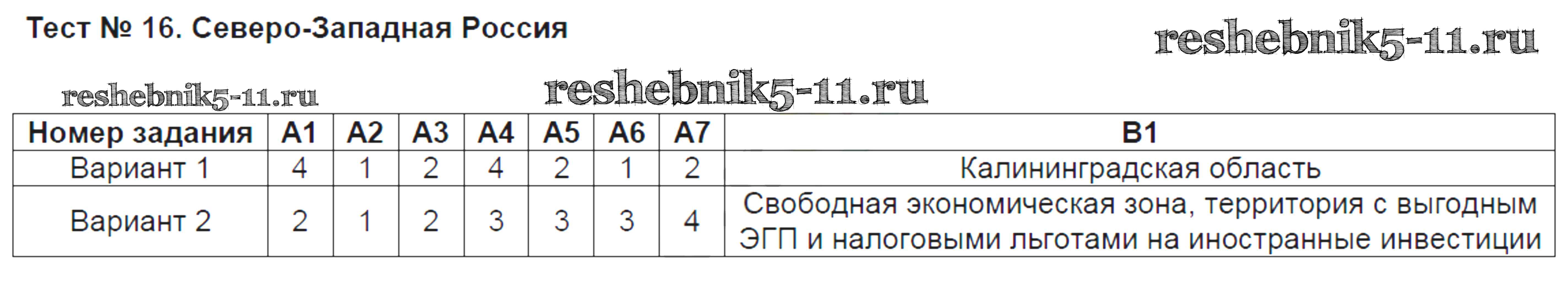 Готовая домашняя работа с ответами по Географии за 9 класс Жижина Контрольно-измерительные материалы (КИМ) ВАКО 2017 ФГОС - Тесты Тест №16. Северо-Западная Россия