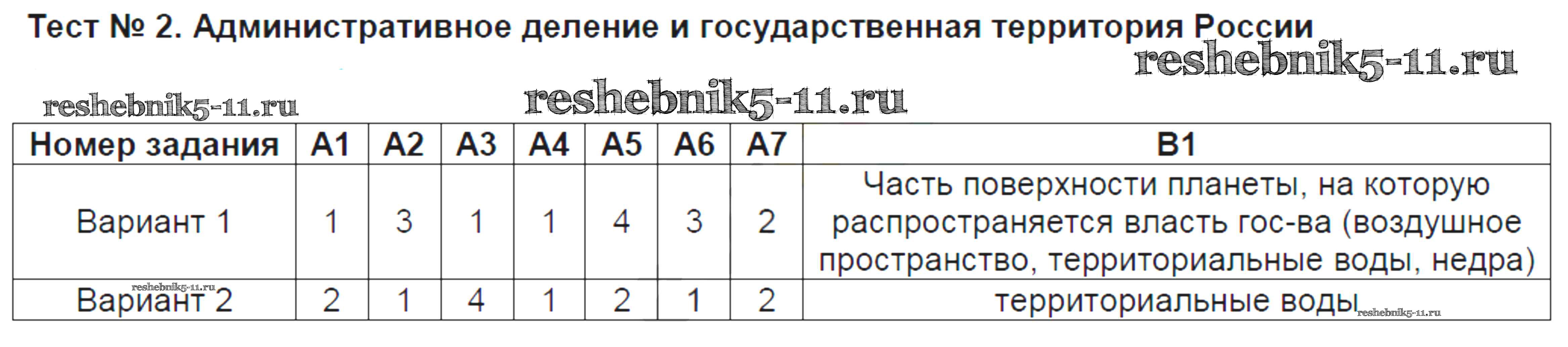 Готовая домашняя работа с ответами по Географии за 9 класс Жижина Контрольно-измерительные материалы (КИМ) ВАКО 2017 ФГОС - Тесты Тест №2. Административное деление и государственная территория России