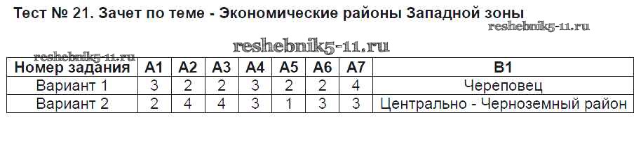 Готовая домашняя работа с ответами по Географии за 9 класс Жижина Контрольно-измерительные материалы (КИМ) ВАКО 2017 ФГОС - Тесты Тест №21. Зачет по теме - Экономические районы Западной зоны