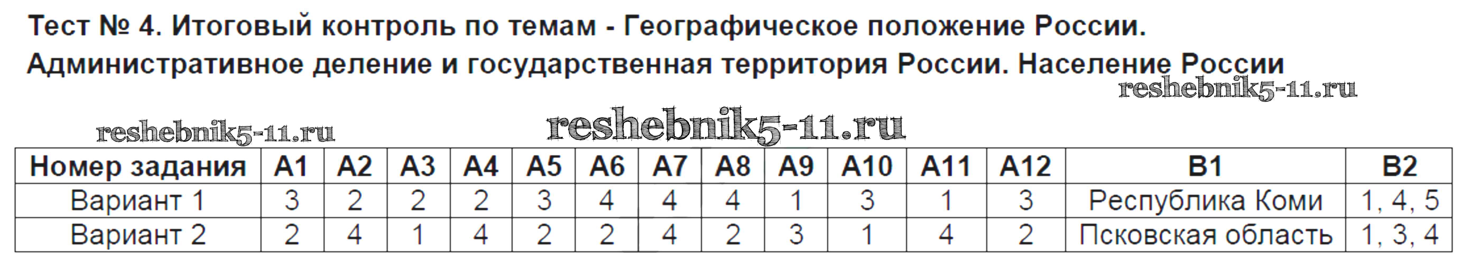 Готовая домашняя работа с ответами по Географии за 9 класс Жижина Контрольно-измерительные материалы (КИМ) ВАКО 2017 ФГОС - Тесты Тест №4. Итоговый контроль по темам - Географическое положение России