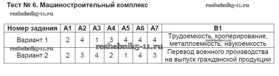 Готовая домашняя работа с ответами по Географии за 9 класс Жижина Контрольно-измерительные материалы (КИМ) ВАКО 2017 ФГОС - Тесты Тест №6. Машиностроительный комплекс