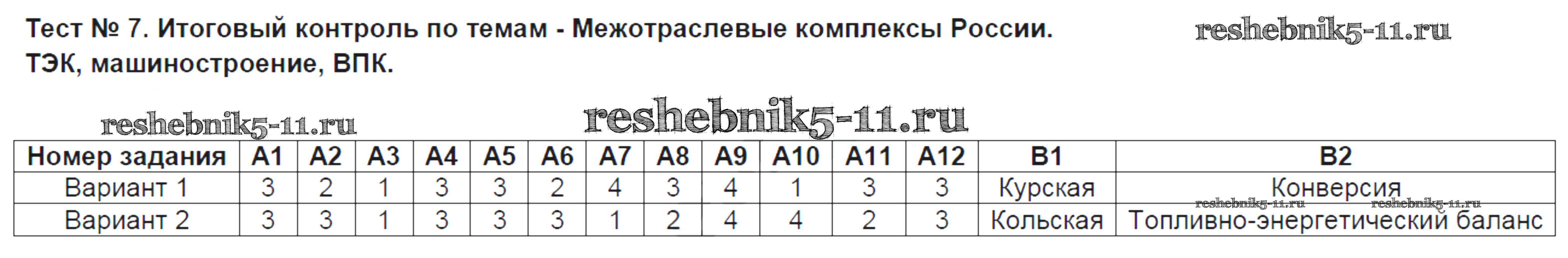 Готовая домашняя работа с ответами по Географии за 9 класс Жижина Контрольно-измерительные материалы (КИМ) ВАКО 2017 ФГОС - Тесты Тест №7. Итоговый контроль по темам - Межотраслевые комплексы России