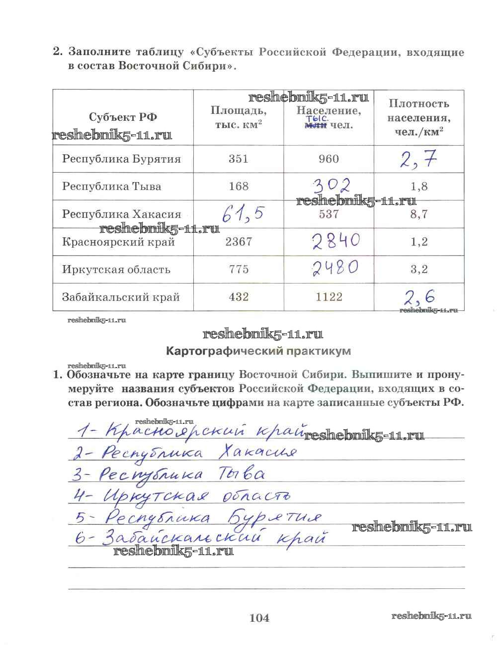 Готовая домашняя работа с ответами по Географии за 9 класс Домогацких Рабочая тетрадь Инновационная школа Русское слово 2018 ФГОС - Часть 2. Страницы 104