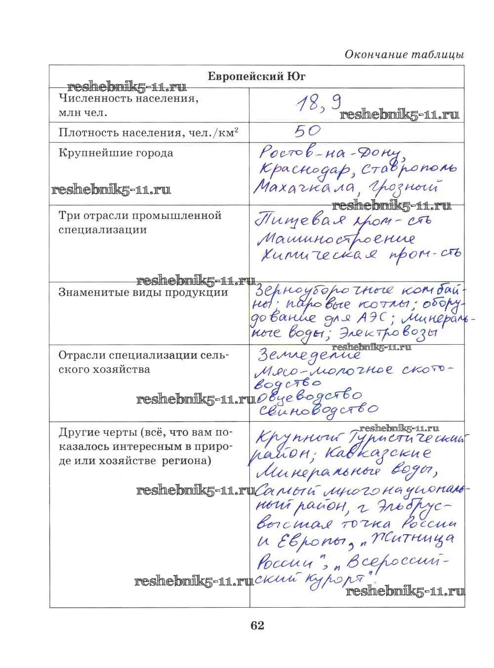 Готовая домашняя работа с ответами по Географии за 9 класс Домогацких Рабочая тетрадь Инновационная школа Русское слово 2018 ФГОС - Часть 2. Страницы 62