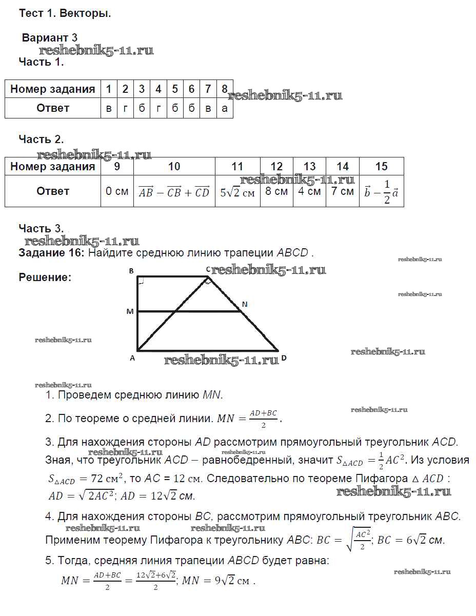 Готовая домашняя работа с ответами по Геометрии за 9 класс Фарков Тесты УМК Экзамен 2016 ФГОС - Тема 1. Варианты 3