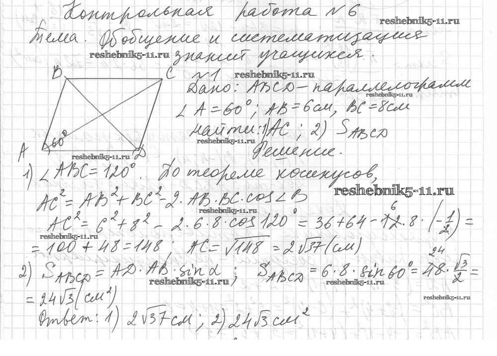 Готовая домашняя работа с ответами по Геометрии за 9 класс Мерзляк, Полонский, Рабинович Дидактические материалы Алгоритм успеха Вентана-граф 2017 ФГОС - КР-6. Варианты 1