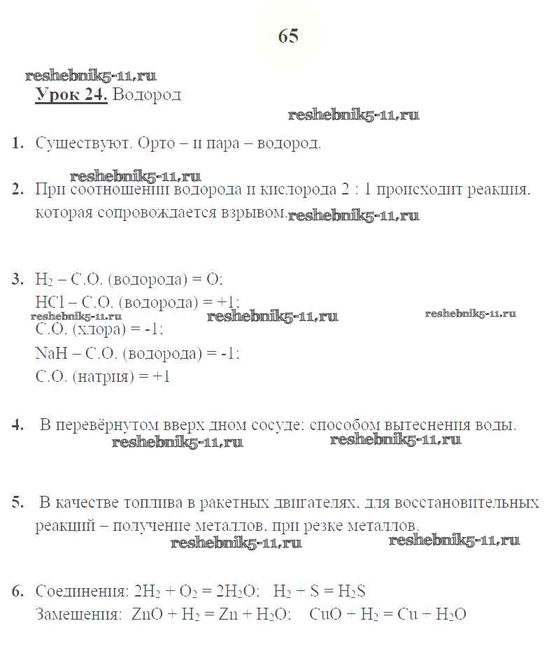 Готовая домашняя работа с ответами по Химии за 9 класс Микитюк Рабочая тетрадь УМК Дрофа 2014 ФГОС - Урок 24. Водород стр.65