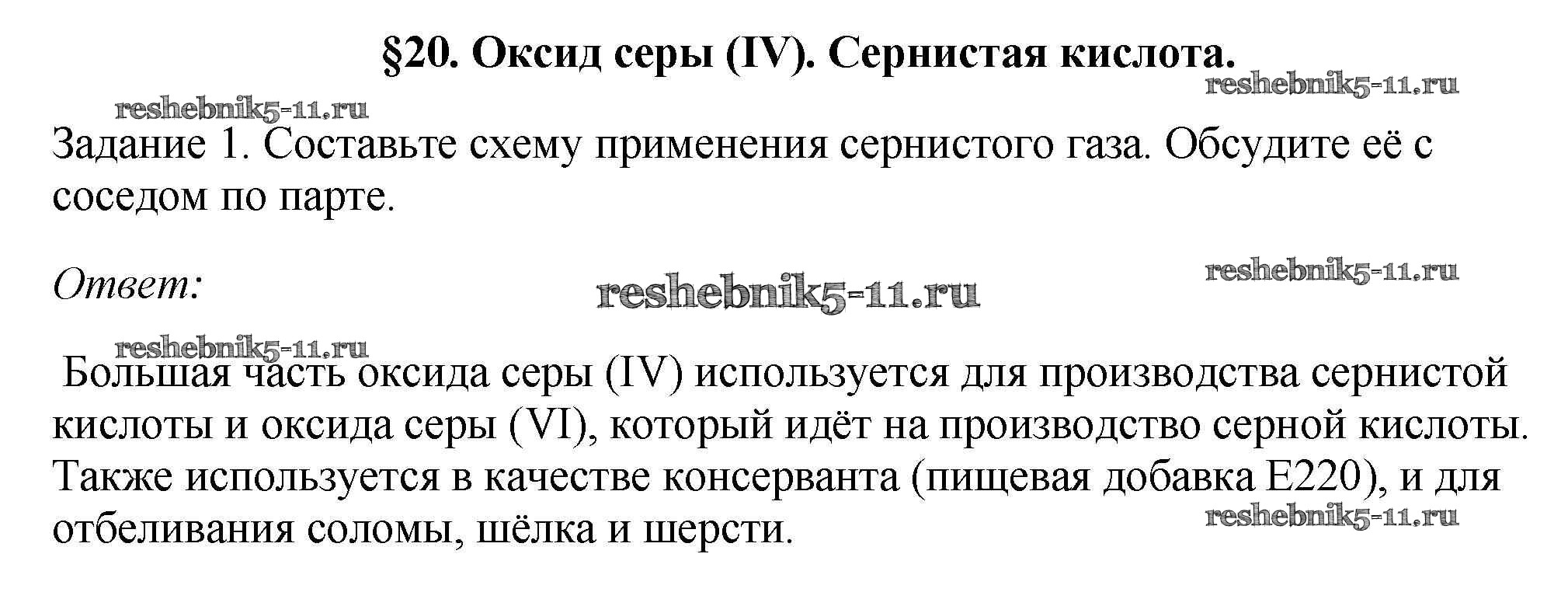 Готовая домашняя работа с ответами по Химии за 9 класс Рудзитис, Фельдман Учебник УМК Просвещение 2016 ФГОС - § 20. Оксид серы (IV). Сернистая кислота 1