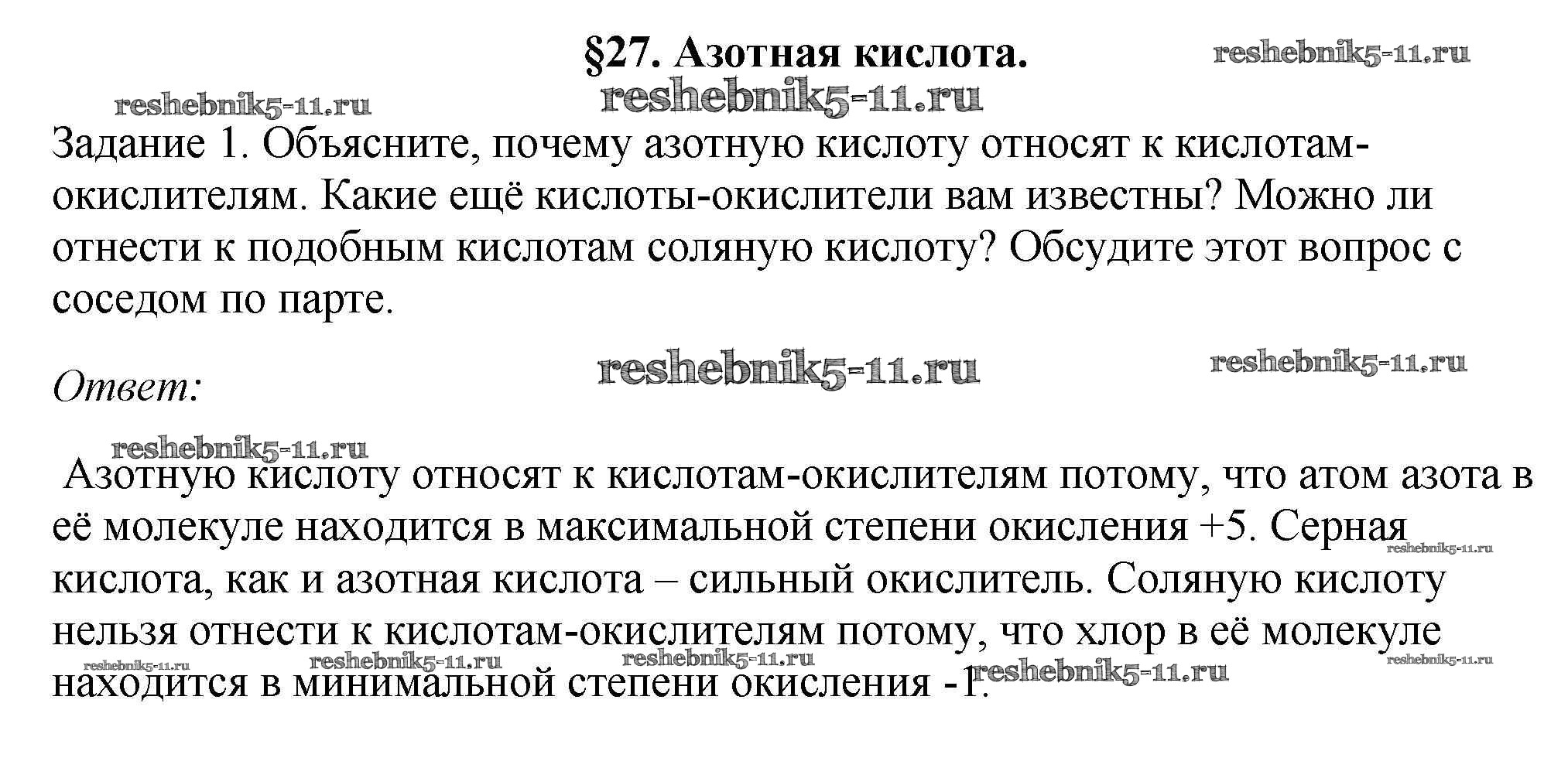 Готовая домашняя работа с ответами по Химии за 9 класс Рудзитис, Фельдман Учебник УМК Просвещение 2016 ФГОС - § 27. Азотная кислота 1