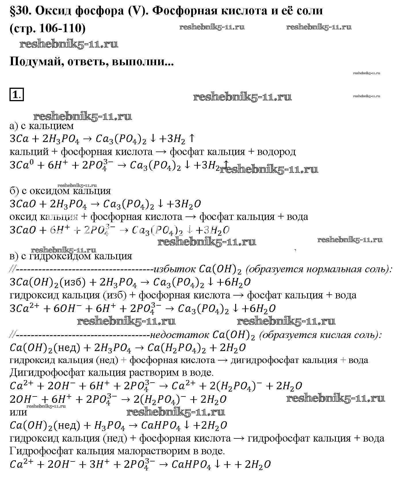 Готовая домашняя работа с ответами по Химии за 9 класс Рудзитис, Фельдман Учебник УМК Просвещение 2016 ФГОС - § 30. Оксид фосфора (IV). Фосфорная кислота и ее соли 1